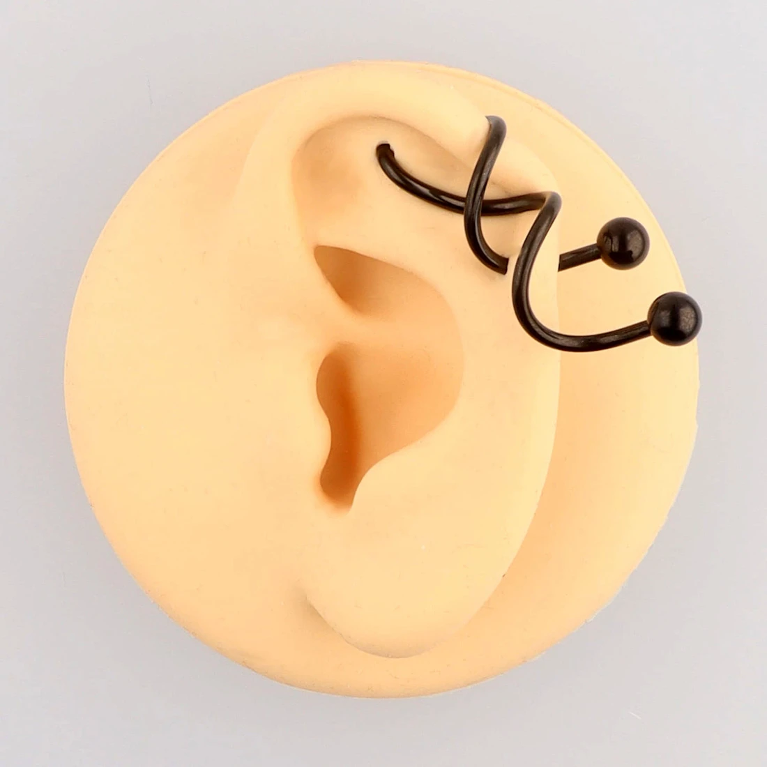 Konstrukcja kolczyka opiera się na fantazyjnie skręconym pręcie, który tworzy efektowną spiralę wokół krawędzi ucha. Biżuteria posiada gwint zewnętrzny, na który nakręcane są dwie klasyczne, gładkie kulki o lustrzanym wykończeniu. Całość jest starannie wypolerowana, co zapewnia gładkość powierzchni i komfort podczas przekładania przez kanał wkłucia. Precyzyjne skręcenie spirali zostało zaprojektowane tak, aby stabilnie układało się na małżowinie usznej.