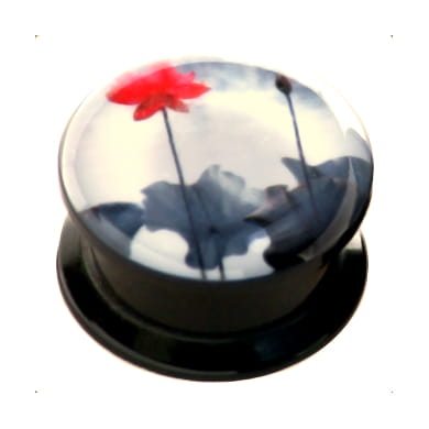 Black acrylic plug with twist-off front wall with red flower design.