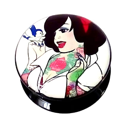 Black acrylic plug with a twist-off front with an image of a naughty version of Disney's Snow White.