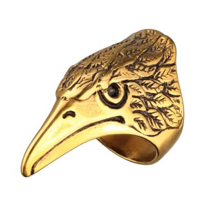 Black ring with front in the shape of a raven's head. Made of anodised 316L steel.