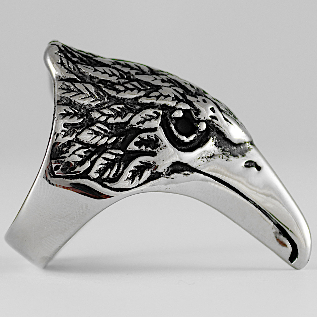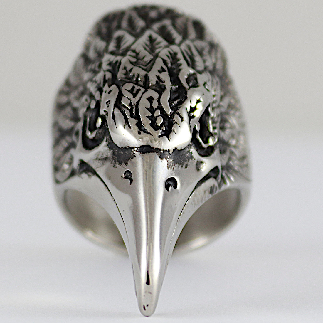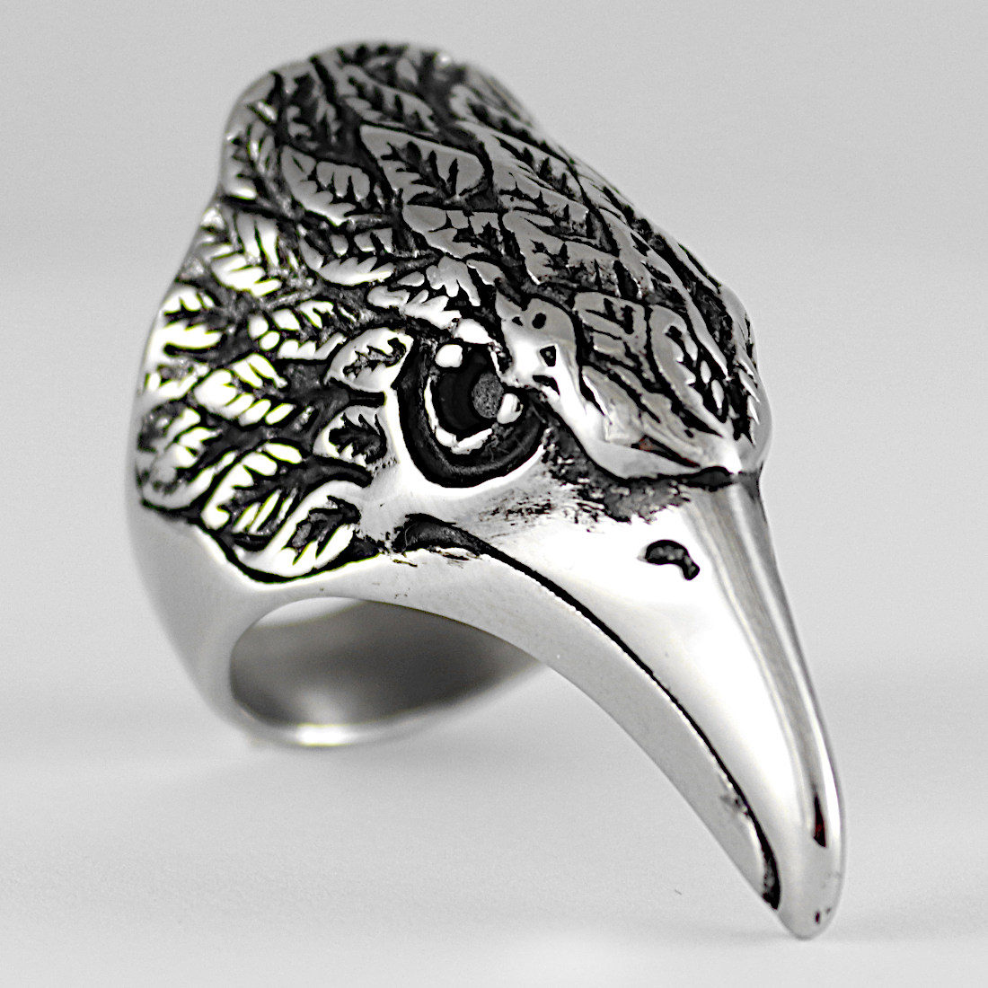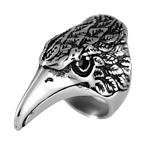 Ring with a front in the shape of a raven's head. Made of oxidised 316L steel.