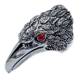 Tall ring with a raven head front with red zircon eyes. Made of oxidised 316L steel.