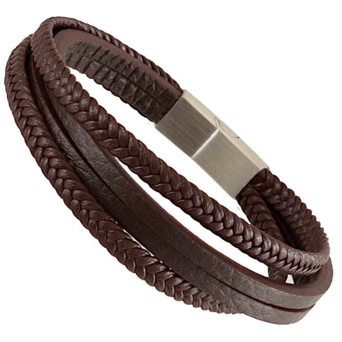 Bracelet with four thongs (two straps and two braids) made of natural leather in dark brown colour.