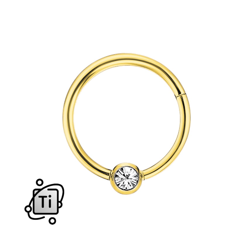 Round piercing closed with a delicate hinged segment made of surgical G23 titanium in natural, dark silver colour and incrusted with a row of crystal white zircon.