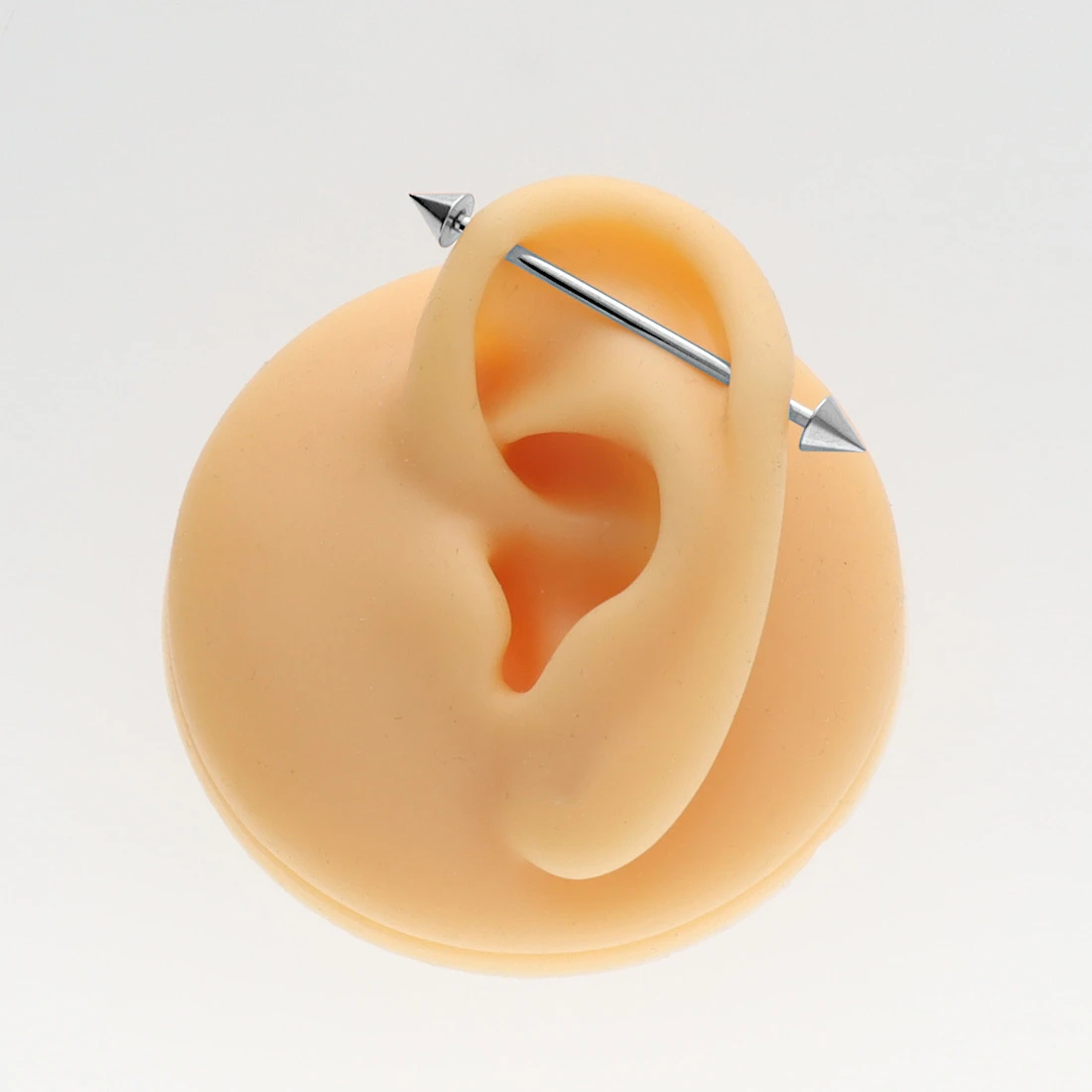 Konstrukcja kolczyka składa się z długiego, prostego pręta o jednolitej grubości, który został zakończony dwioma klasycznymi stożkami. Obie nakrętki są odkręcane dzięki zewnętrznym, co pozwala na wygodne zakładanie biżuterii oraz ewentualną personalizację poprzez wymianę zakończeń. Całość została poddana starannemu polerowaniu na wysoki połysk, co nadaje powierzchni lustrzane odbicie i idealną gładkość.
