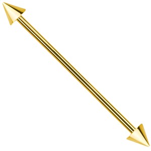 Klasyczna złota sztanga przeznaczona do przekłucia typu industrial, wykonana z wysokiej jakości stali chirurgicznej 316L. Materiał ten charakteryzuje się wyjątkową trwałością oraz odpornością na czynniki zewnętrzne, co sprawia, że biżuteria nie rdzewieje i nie traci swojego pierwotnego blasku nawet przy codziennym użytkowaniu. Gładka, polerowana powierzchnia stali jest bezpieczna dla skóry i ułatwia utrzymanie odpowiedniej higieny miejsca przekłucia. Kolorowa powłoka uzyskana metodą PVD gwarantuje bardzo dużą twardość i odporność na ścieranie.