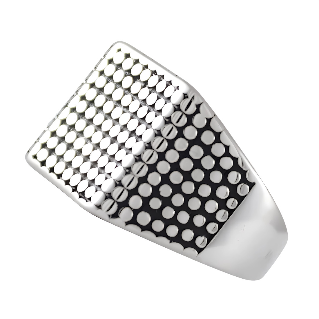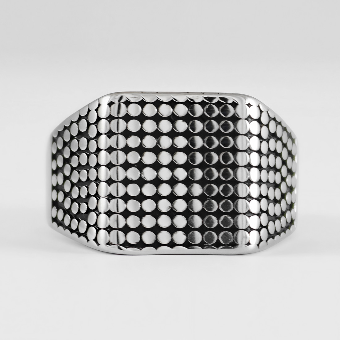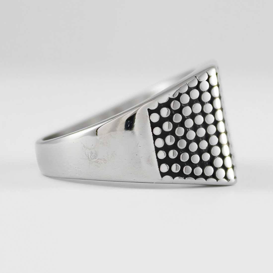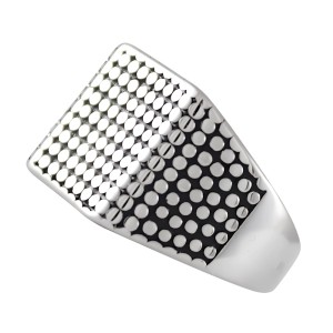 Sygnet o prostej, ale wyrazistej stylistyce, który łączy w sobie nowoczesność z klasycznym designem. Ma kwadratową tarczę z zaokrąglonymi rogami. Tarcza sygnetu jest ozdobiona regularnym wzorem małych, okrągłych uwypukleń, które rozmieszczone w rzędach, tworzą efekt geometrycznej siatki. Wgłębienia pomiędzy nimi zostały mocno zoksydowane i stanowią efektowny kontrast dla jasnych polerowanych elementów.