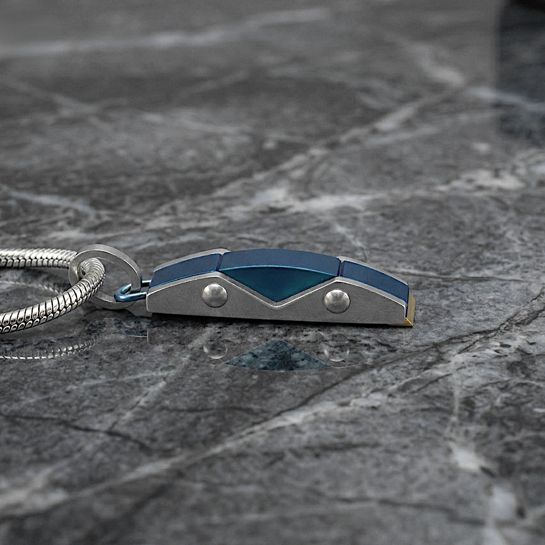 Konstrukcja zawieszki opiera się na pionowym, geometrycznym segmencie przypominającym ogniwo łańcucha technicznego. Budowa jest trójwarstwowa: centralna, niebieska część jest osadzona pomiędzy dwiema stalowymi płytkami o naturalnym, srebrzystym kolorze. Boczne elementy zostały połączone z korpusem za pomocą ozdobnych nitów, co nadaje całości surowy wygląd. Powierzchnie są starannie wypolerowane na połysk, co podkreśla kontrast między chłodną stalą a intensywnym błękitem powłoki PVD. Zawieszkę wyposażono w solidny, ruchomy uchwyt.