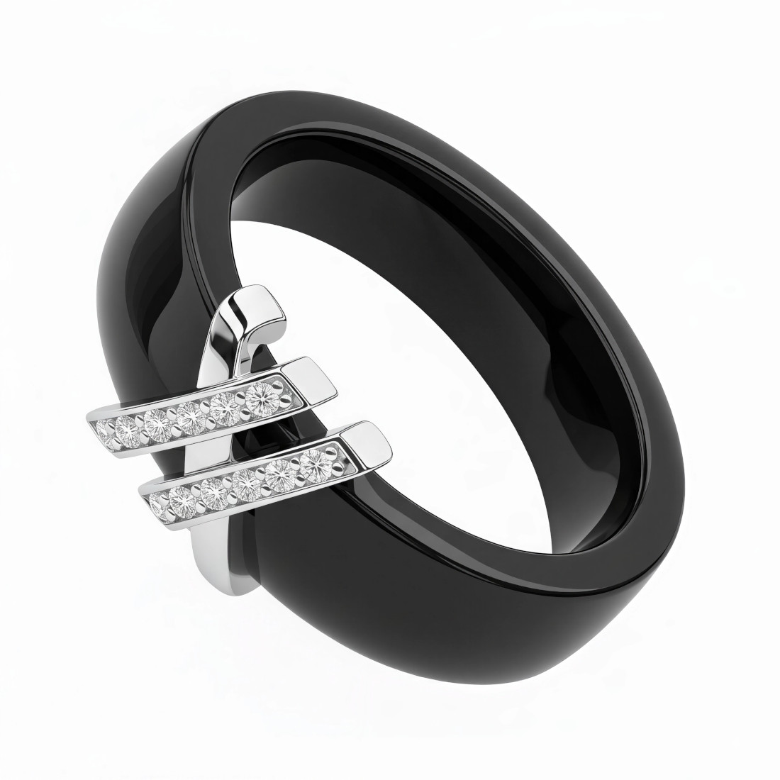 Elegancki pierścionek ceramiczny z elementem ozdobnym ze Stali 316L i cyrkonii. Podstawę konstrukcji stanowi masywna obrączka wykonana z wysokiej klasy czarnej ceramiki, która dzięki procesowi precyzyjnego polerowania zyskała nieskazitelną gładkość i głęboki, lustrzany blask. Materiał ten jest ceniony nie tylko za swój luksusowy wygląd, ale również za wyjątkową twardość i właściwości hipoalergiczne, co czyni go idealnym wyborem dla osób o wrażliwej skórze.