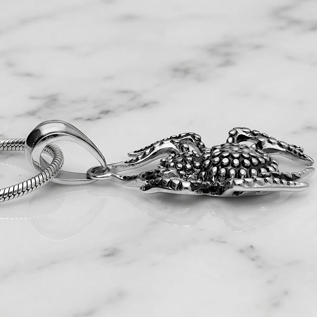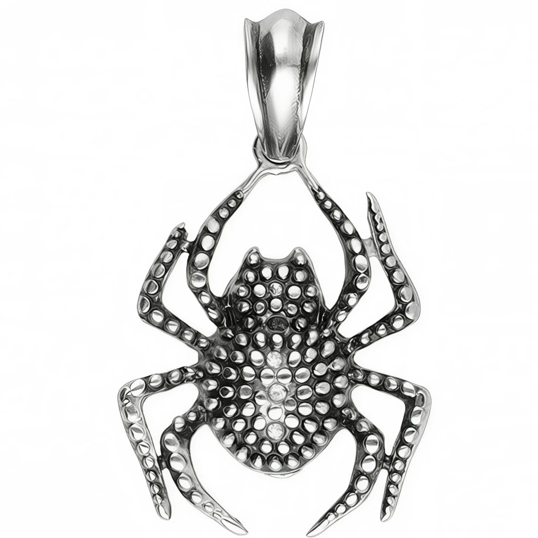 Produkt przedstawia realistycznie odwzorowaną sylwetkę pająka. Powierzchnia tułowia oraz odnóży została wykończona drobną, wypukłą fakturą przypominającą kuleczki, co nadaje całości trójwymiarowy charakter. W centralnej części odwłoka umieszczono trzy drobne, transparentne cyrkonie, które stanowią delikatny akcent rozświetlający. Ciemniejsze wykończenie zagłębień tworzy efekt oksydacji, podkreślając detale i strukturę metalu. Całość zawieszona jest na gładkim, polerowanym krawatkowym uchwycie, który umożliwia łatwe nawleczenie na łańcuch o różnej grubości.