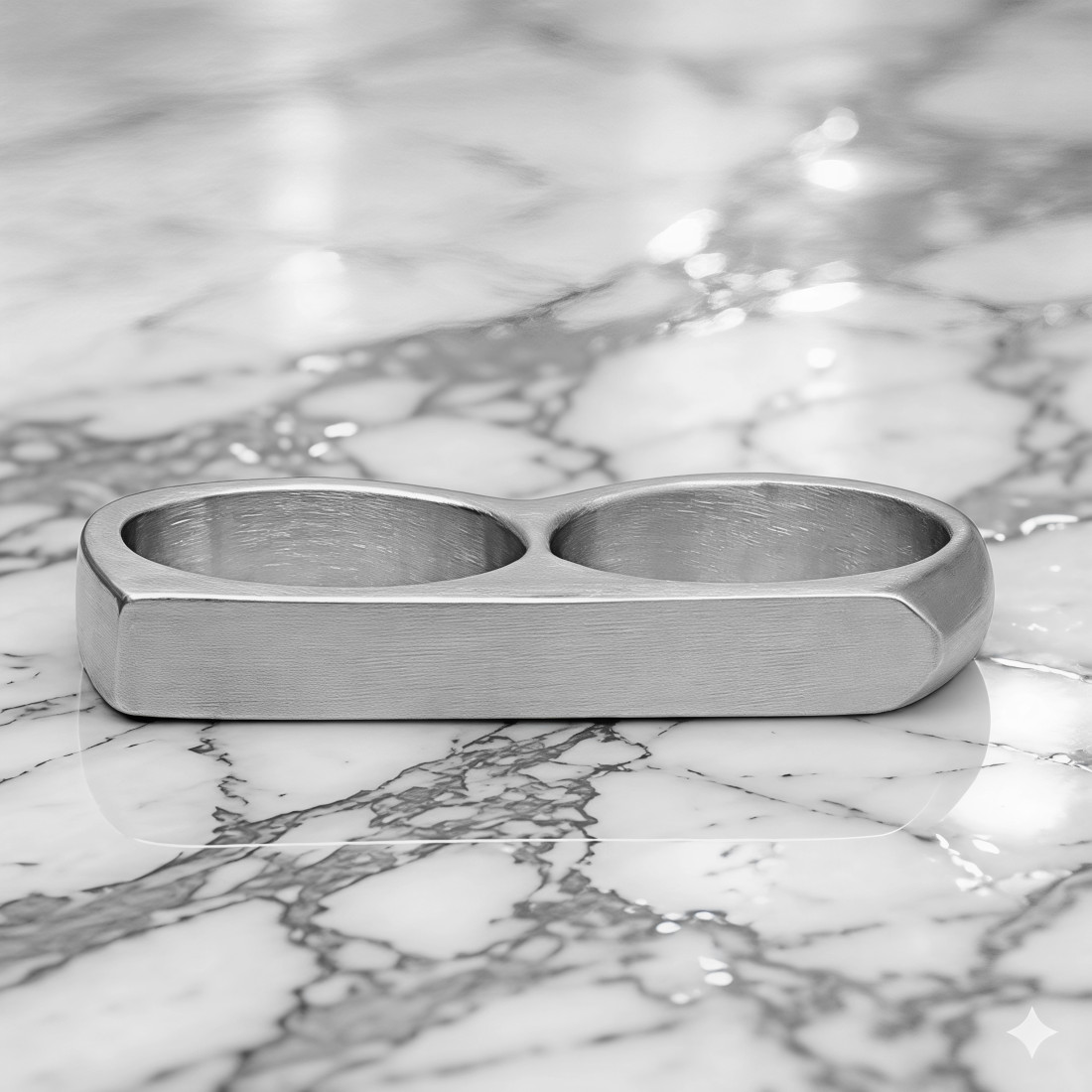 Konstrukcja pierścionka opiera się na dwóch połączonych obręczach wpisanych w sztywną, prostokątną formę o zaokrąglonych krawędziach. Powierzchnia metalu została poddana precyzyjnemu szczotkowaniu, co nadaje jej matowe, satynowe wykończenie z delikatną, liniową strukturą. Taki sposób obróbki sprawia, że na biżuterii nie są widoczne odciski palców, a światło odbija się w sposób stonowany. Wnętrze obrączek jest wypolerowane, co zapewnia komfort podczas zakładania i noszenia.