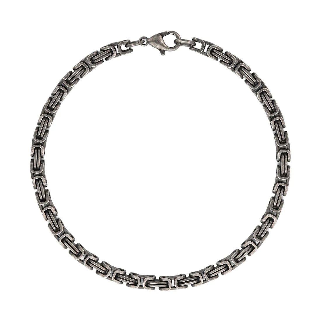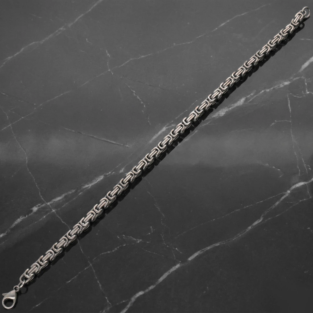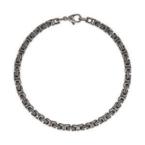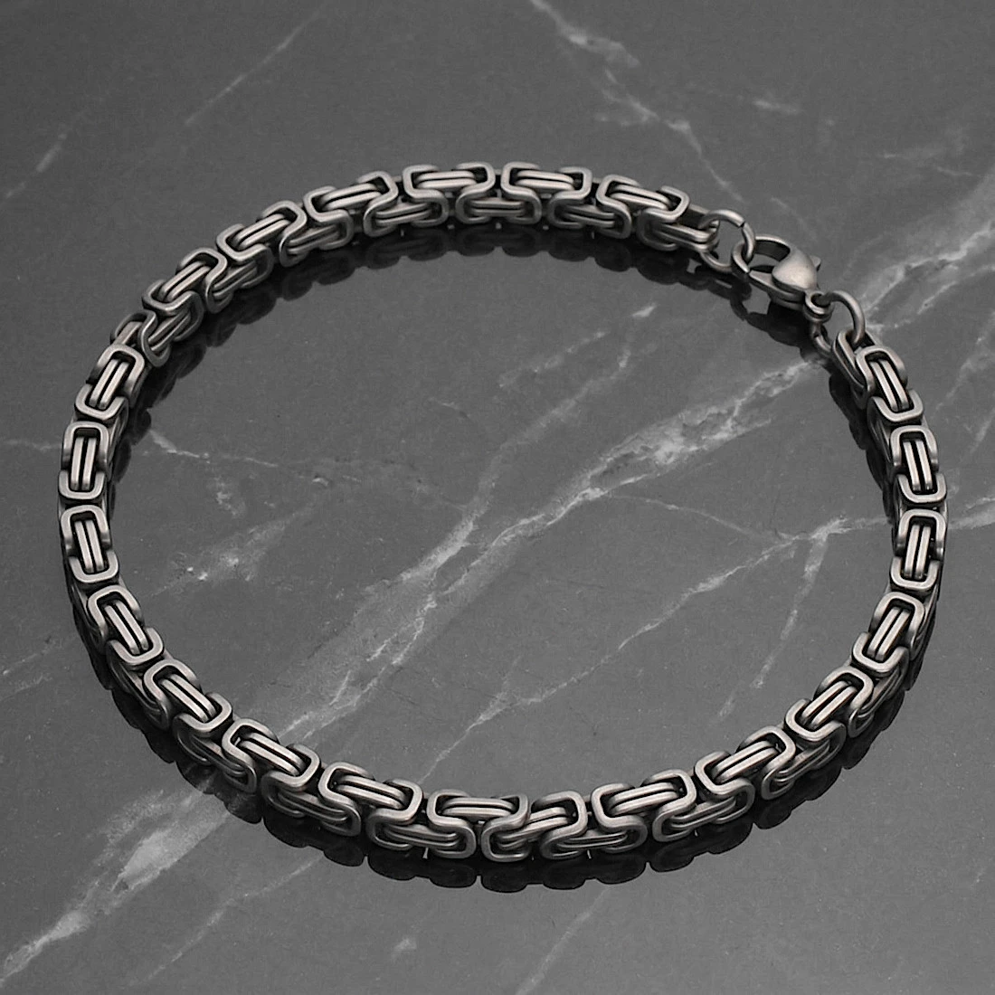 Konstrukcja bransolety opiera się na klasycznym splocie królewskim o zwartym, geometrycznym układzie ogniw i kwadratowym przekroju. Cała powierzchnia metalu została poddana procesowi szczotkowania, co nadaje jej matowe wykończenie i ogranicza powstawanie widocznych śladów użytkowania czy odcisków palców. Dodatkowe przyciemnienia w miejscach łączenia ogniw podkreślają złożoność splotu i nadają mu wizualną głębię. Produkt został wyposażony w solidne zapięcie typu karabińczyk, które kolorystycznie spójne jest z całością bransolety.