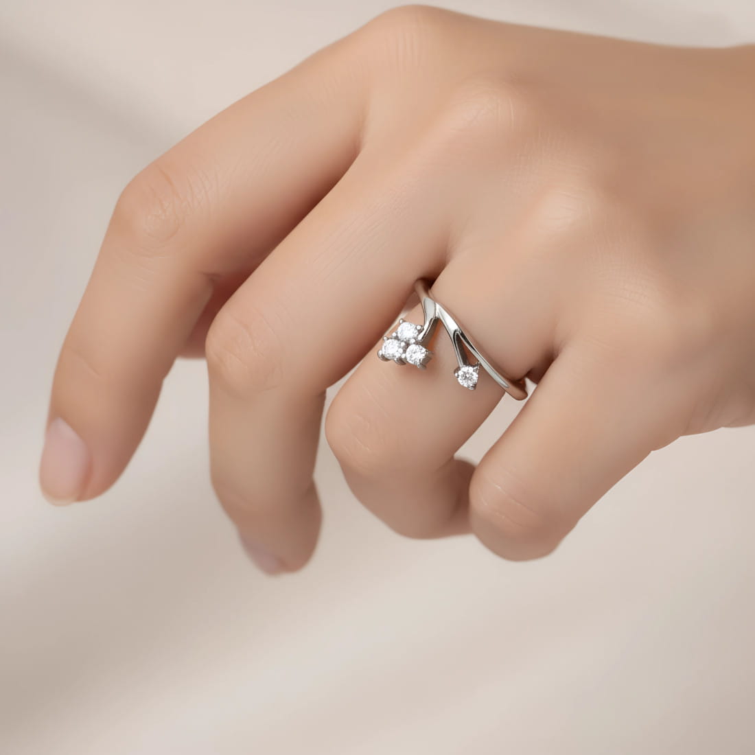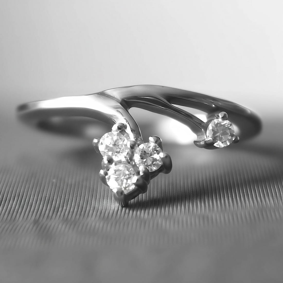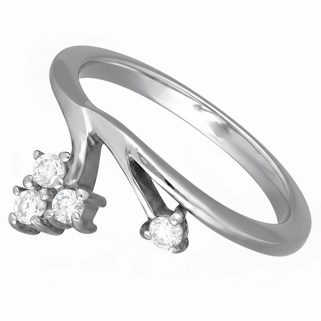 Jego asymetryczna obręcz rozdziela się z przodu na dwa ramiona. Na końcu pierwszego z nich osadzono pojedynczą, błyszczącą cyrkonię, na końcu drugiego znajduje się grupa czterech cyrkonii, które są zgromadzone blisko siebie, tworząc kompozycję przypominającą grono. Całość tworzy nowoczesną, a zarazem elegancką całość, która pięknie układa się na palcu.