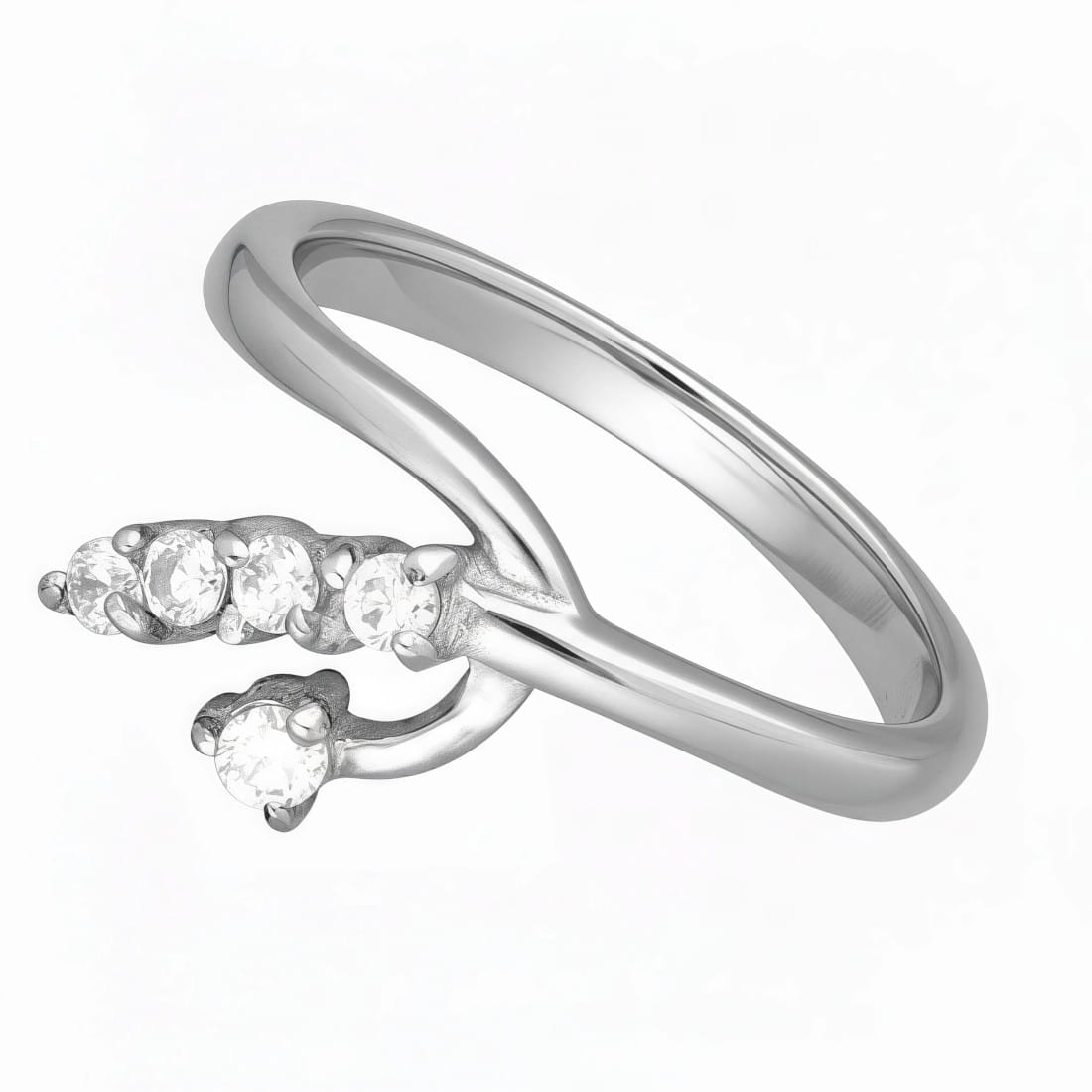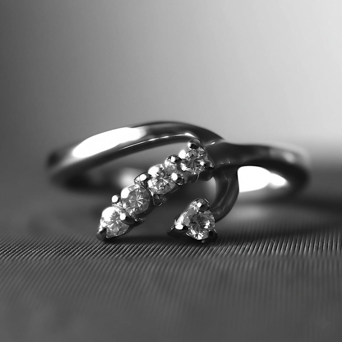 Jego asymetryczna obręcz rozdziela się z przodu na dwa ramiona. Na końcu pierwszego z nich osadzono pojedynczą, błyszczącą cyrkonię, na końcu drugiego znajduje się rząd czterech cyrkonii takiej samej wielkości. Całość tworzy nowoczesną, a zarazem elegancką całość, która pięknie układa się na palcu.