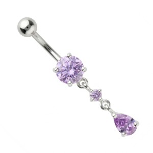 Dekoracyjny wygięty kolczyk do pępka, banan ze stali chirurgicznej w naturalnym srebrnym kolorze. Do banana dowieszona jest ozdoba ze Srebra próby 925 i zakuwanych cyrkonii. Ozdoba składa się z trzech elementów, z których pierwszy jest zlutowany ze sztangą. Pozostałe, dowieszone na ogniwkach, są elementami ruchomymi.