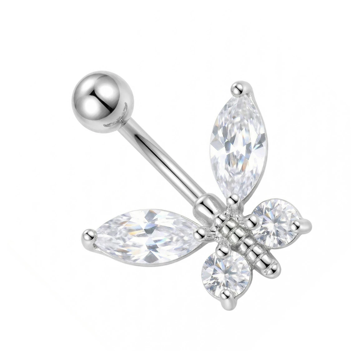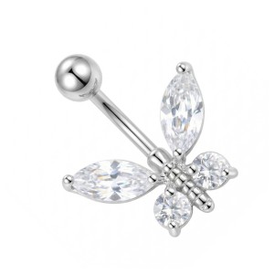 Dekoracyjny wygięty kolczyk do pępka, banan ze stali chirurgicznej w naturalnym srebrnym kolorze. Do banana dowieszona jest ozdoba ze Srebra próby 925 i zakuwanych cyrkonii. Ozdoba w kształcie motylka, jest zlutowana ze sztangą.