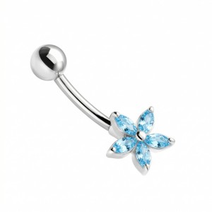 Dekoracyjny wygięty kolczyk do pępka, banan ze stali chirurgicznej w naturalnym srebrnym kolorze. Do banana dowieszona jest ozdoba ze Srebra próby 925 i zakuwanych cyrkonii. Ozdoba w formie delikatnego kwiatka jest zlutowana ze sztangą.