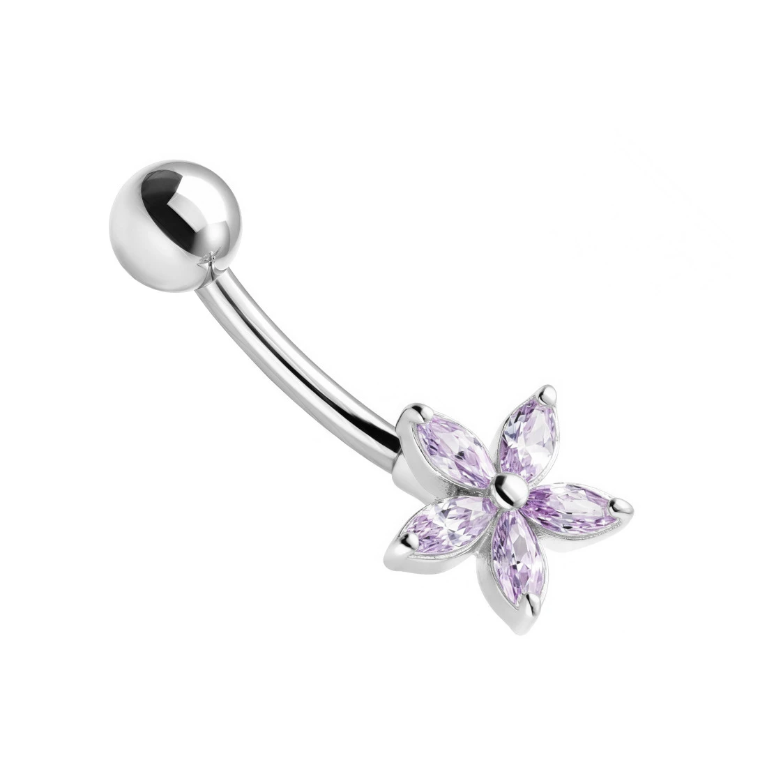 Dekoracyjny wygięty kolczyk do pępka, banan ze stali chirurgicznej w naturalnym srebrnym kolorze. Do banana dowieszona jest ozdoba ze Srebra próby 925 i zakuwanych cyrkonii. Ozdoba w kształcie delikatnego kwiatka jest zlutowana sztywno ze sztangą.