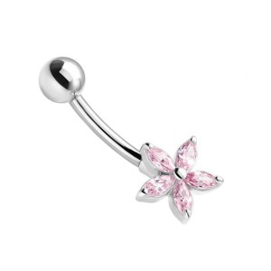 Dekoracyjny wygięty kolczyk do pępka, banan ze stali chirurgicznej w naturalnym srebrnym kolorze. Do banana dowieszona jest ozdoba ze Srebra próby 925 i zakuwanych cyrkonii. Ozdoba w formie delikatnego kwiatka jest zlutowana ze sztangą.