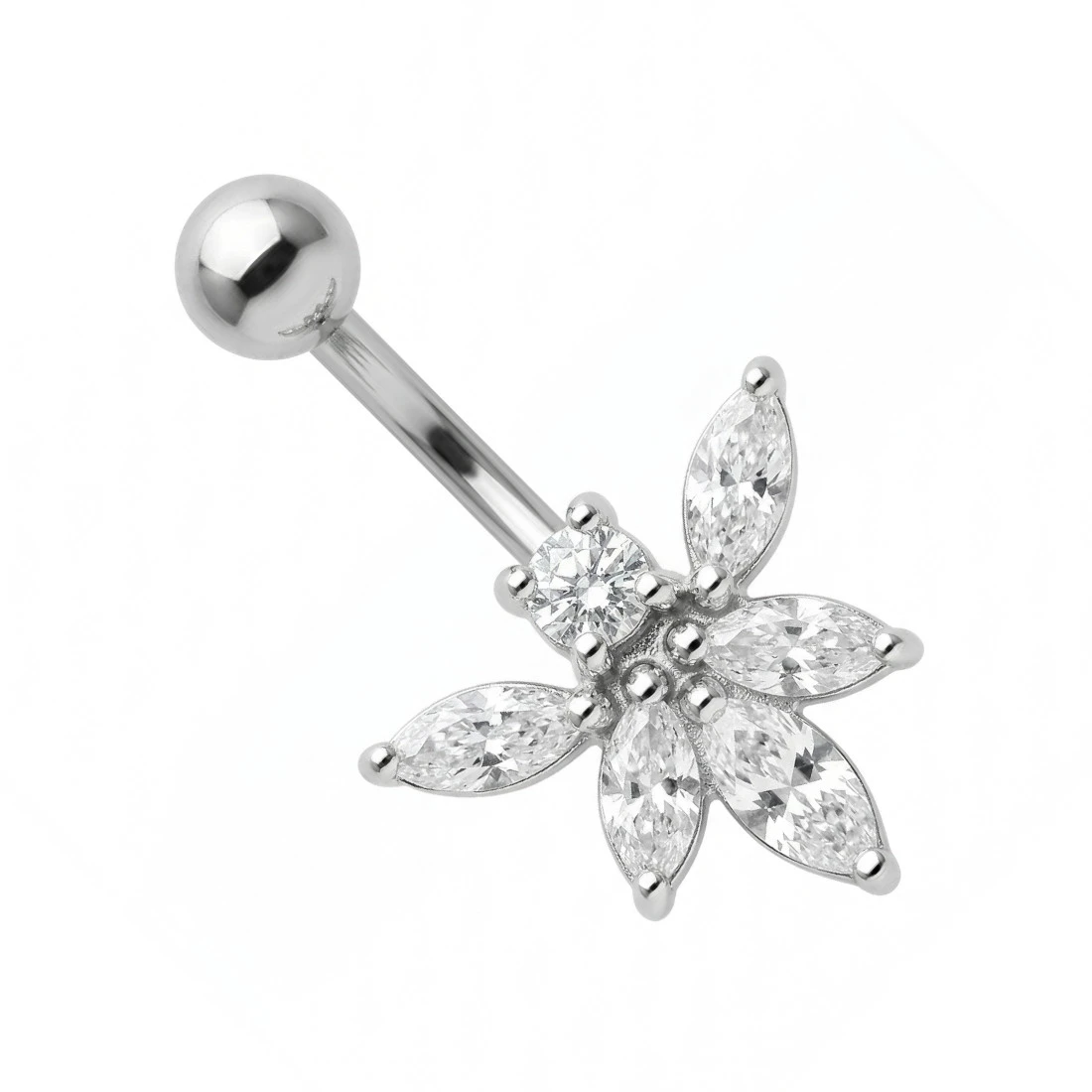 Dekoracyjny wygięty kolczyk do pępka, banan ze stali chirurgicznej w naturalnym srebrnym kolorze. Do banana dowieszona jest ozdoba ze Srebra próby 925 i zakuwanych cyrkonii. Ozdoba w formie kwiatka jest zlutowana sztywno ze sztangą.