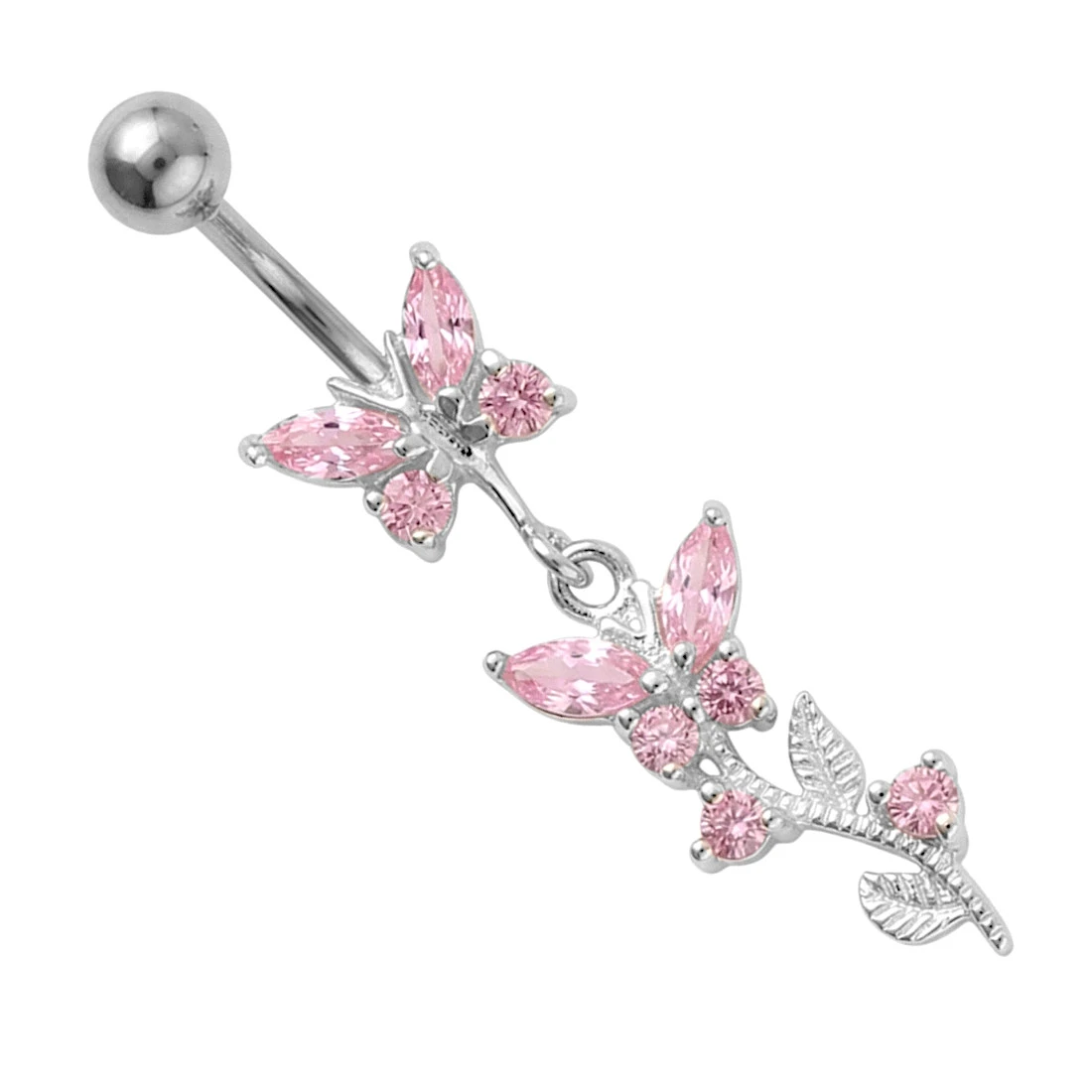 Dekoracyjny wygięty kolczyk do pępka, banan ze stali chirurgicznej w naturalnym srebrnym kolorze. Do banana dowieszona jest ozdoba ze Srebra próby 925 i zakuwanych cyrkonii. Ozdoba składa się z dwóch elementów. Pierwszy, jest zlutowany sztywno ze sztangą, drugi, połączony za pomocą ogniw, jest ruchomy.