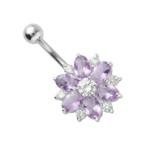 Dekoracyjny wygięty kolczyk do pępka, banan ze stali chirurgicznej w naturalnym srebrnym kolorze. Do banana dowieszona jest ozdoba ze Srebra próby 925 i zakuwanych cyrkonii. Ozdoba w formie kwiatka jest zlutowana sztywno ze sztangą.