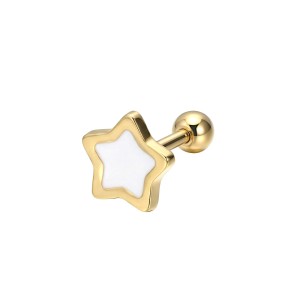 Kolczyk charakteryzuje się budową typu barbell z zewnętrznym gwintem umieszczonym na prostym pręcie, na który nakręcana jest gładka, stalowa kulka zabezpieczająca. Element ozdobny ma formę gwiazdki, której wnętrze wypełnione jest białą emalią, co tworzy efektowne połączenie ze złotą oprawą. Całość wykończona jest z dbałością o gładkość krawędzi, co zapewnia komfort podczas codziennego noszenia i łatwość w utrzymaniu czystości.