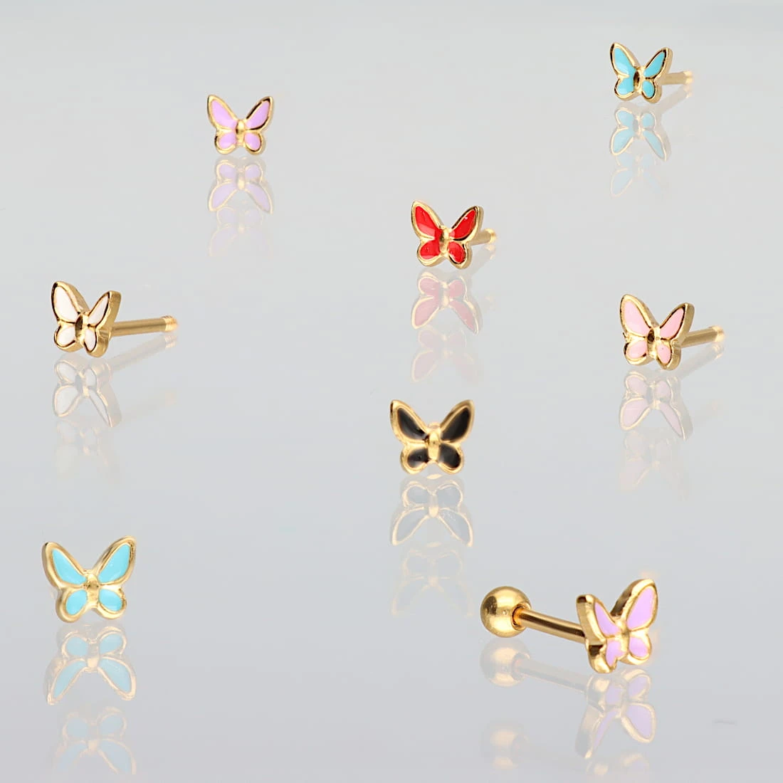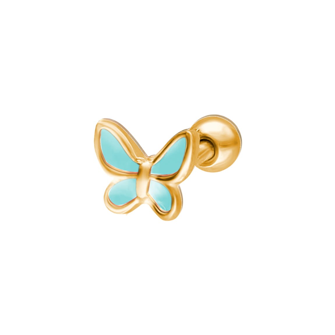Kolczyk charakteryzuje się budową typu barbell z zewnętrznym gwintem umieszczonym na prostym pręcie, na który nakręcana jest gładka, stalowa kulka zabezpieczająca. Element ozdobny ma formę małego motylka, którego wnętrze wypełnia gładka emalia w błękitnym kolorze. Kontur motywu oraz jego tylna część są precyzyjnie wykończone na wysoki połysk.