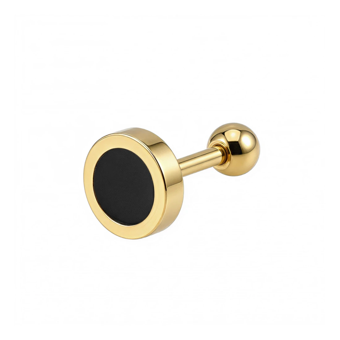 Kolczyk charakteryzuje się budową typu barbell z zewnętrznym gwintem umieszczonym na prostym pręcie, na który nakręcana jest gładka, stalowa kulka zabezpieczająca. Element dekoracyjny ma formę płaskiego, gładkiego krążka o wysokim połysku, którego środek wypełnia emalia w czarnym kolorze. Całość wykończona jest z dbałością o gładkość krawędzi, co zapewnia komfort podczas codziennego noszenia i łatwość w utrzymaniu czystości.