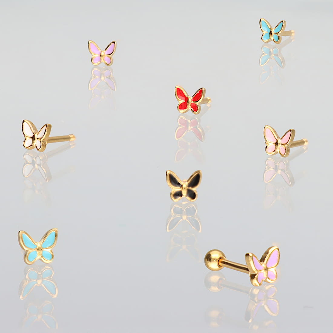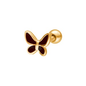 Kolczyk charakteryzuje się budową typu barbell z zewnętrznym gwintem umieszczonym na prostym pręcie, na który nakręcana jest gładka, stalowa kulka zabezpieczająca. Element ozdobny ma formę małego motylka, którego wnętrze wypełnia gładka emalia w czarnym kolorze. Kontur motywu oraz jego tylna część są precyzyjnie wykończone na wysoki połysk.