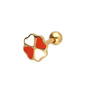 Kolczyk charakteryzuje się budową typu barbell z zewnętrznym gwintem umieszczonym na prostym pręcie, na który nakręcana jest gładka, stalowa kulka zabezpieczająca. Element ozdobny ma formę czterolistnej koniczyny o lekko wypukłych krawędziach. Wnętrze płatków wypełniono emalią w dwóch kontrastowych kolorach: czerwieni i bieli, ułożonych naprzemiennie. Całość powierzchni jest precyzyjnie wypolerowana na wysoki połysk, co podkreśla gładkość metalu i emalii.