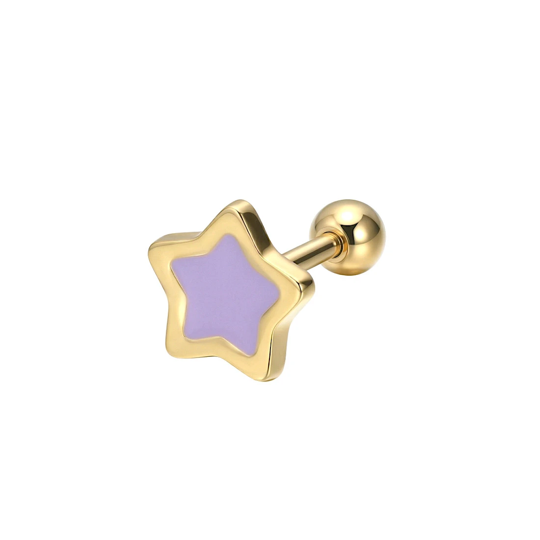 Kolczyk charakteryzuje się budową typu barbell z zewnętrznym gwintem umieszczonym na prostym pręcie, na który nakręcana jest gładka, stalowa kulka zabezpieczająca. Element ozdobny ma formę gwiazdki, której wnętrze wypełnione jest emalią w jasnofioletowym odcieniu, co tworzy efektowne połączenie ze złotą oprawą. Całość wykończona jest z dbałością o gładkość krawędzi, co zapewnia komfort podczas codziennego noszenia i łatwość w utrzymaniu czystości.