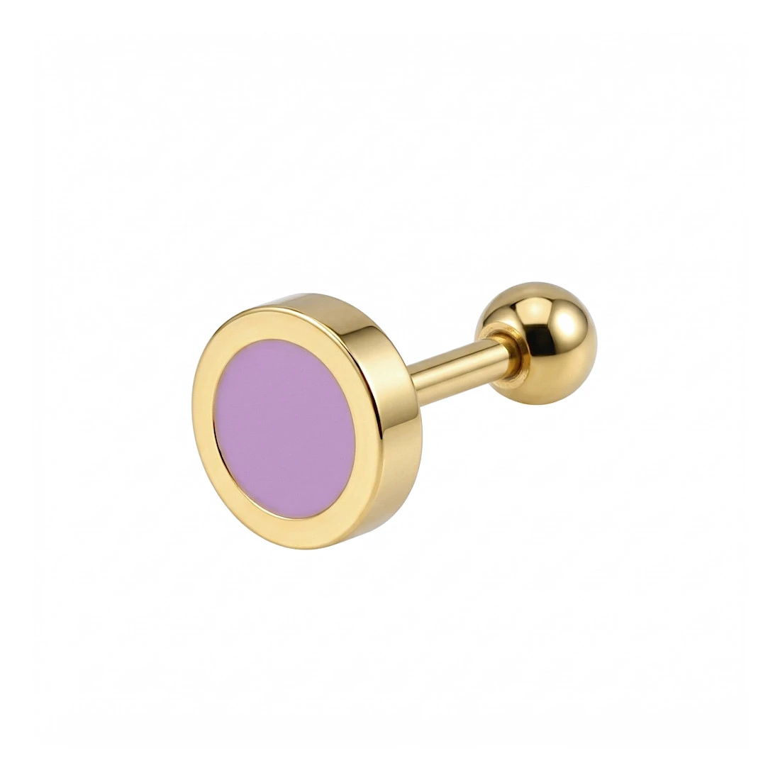 Kolczyk charakteryzuje się budową typu barbell z zewnętrznym gwintem umieszczonym na prostym pręcie, na który nakręcana jest gładka, stalowa kulka zabezpieczająca. Element dekoracyjny ma formę płaskiego, gładkiego krążka o wysokim połysku, którego środek wypełnia emalia w kolorze pastelowego fioletu. Całość wykończona jest z dbałością o gładkość krawędzi, co zapewnia komfort podczas codziennego noszenia i łatwość w utrzymaniu czystości.
