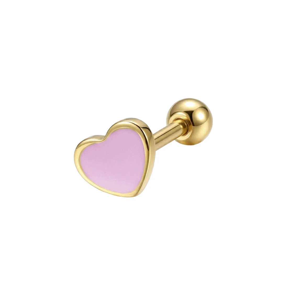 Kolczyk charakteryzuje się budową typu barbell z zewnętrznym gwintem umieszczonym na prostym pręcie, na który nakręcana jest gładka, stalowa kulka zabezpieczająca. Element dekoracyjny ma formę serca z gładką, lawendową powierzchnią uzyskaną dzięki nałożeniu emalii. Całość została precyzyjnie wypolerowana na wysoki połysk, co nadaje biżuterii estetyczny wygląd.