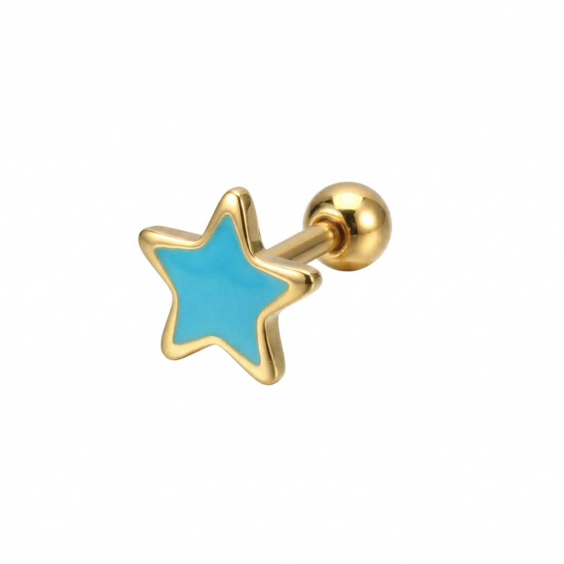 Kolczyk charakteryzuje się budową typu barbell z zewnętrznym gwintem umieszczonym na prostym pręcie, na który nakręcana jest gładka, stalowa kulka zabezpieczająca. Element ozdobny ma formę gwiazdki, której wnętrze wypełnione jest emalią w energetycznym turkusowym kolorze, co tworzy efektowny kontrast ze złotą oprawą.