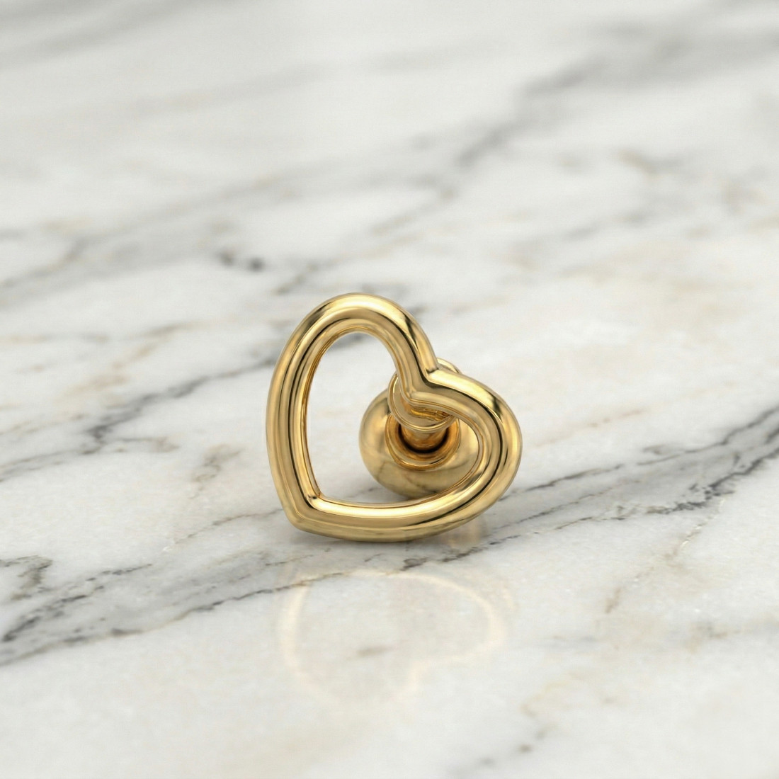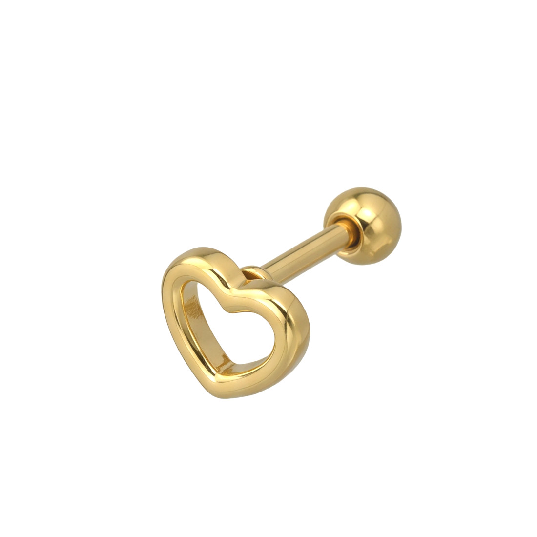 Kolczyk charakteryzuje się budową typu barbell z zewnętrznym gwintem umieszczonym na prostym pręcie, na który nakręcana jest gładka, stalowa kulka zabezpieczająca. Element ozdobny ma postać konturu serca o gładkich, zaokrąglonych krawędziach.