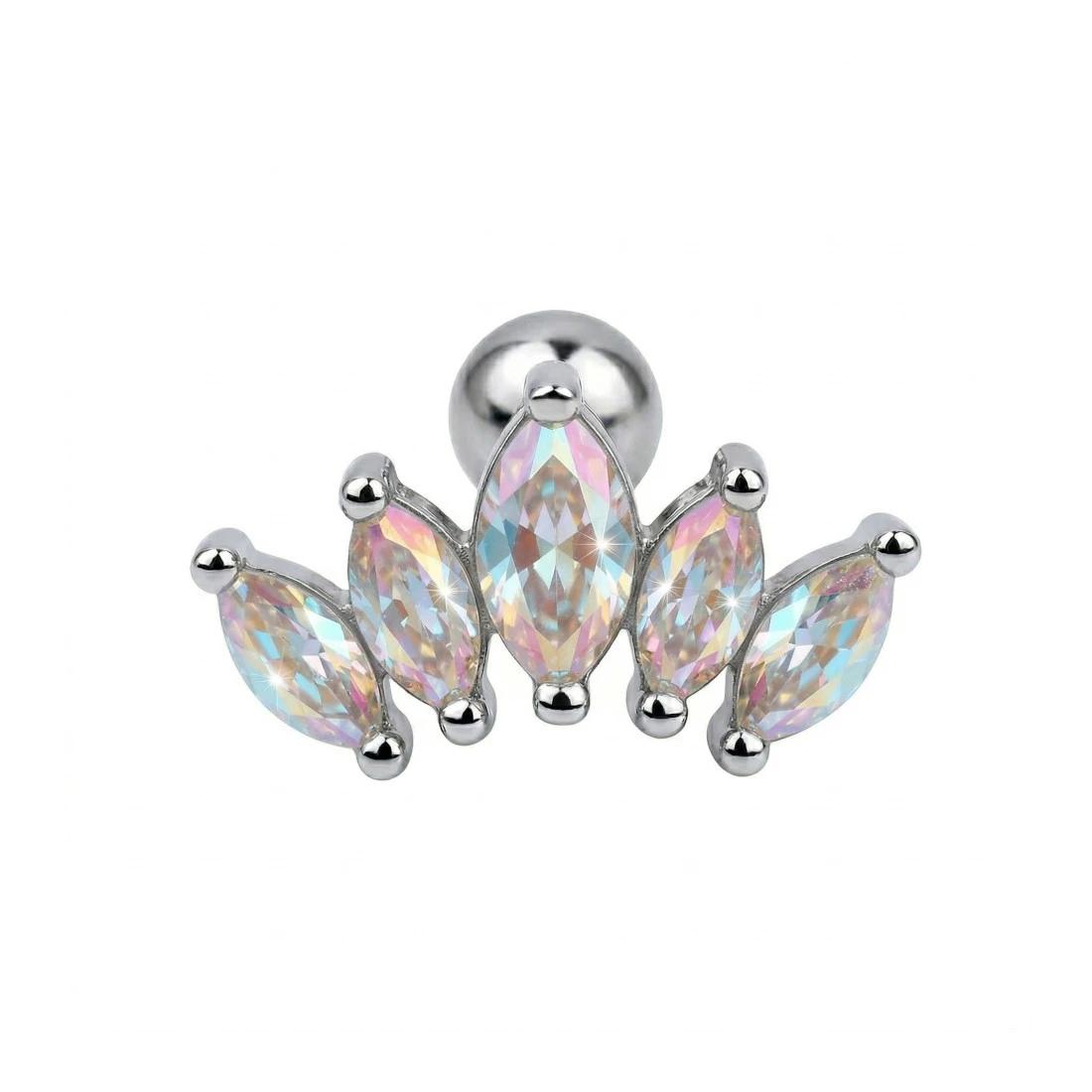 Konstrukcja kolczyka opiera się na klasycznej sztandze zakończonej z jednej strony gładką kulką, a z drugiej ozdobnym elementem w kształcie łuku. Część dekoracyjną tworzy pięć cyrkonii o szlifie marquise, ułożonych kaskadowo od największej w centrum do mniejszych po bokach. Kamienie posiadają powłokę Aurora Borealis (AB), która sprawia, że mienią się one wieloma barwami w zależności od kąta padania światła. Każda cyrkonia została osadzona w solidnej oprawie typu szatonowego, co zapewnia stabilność kamieni i eksponuje ich blask.