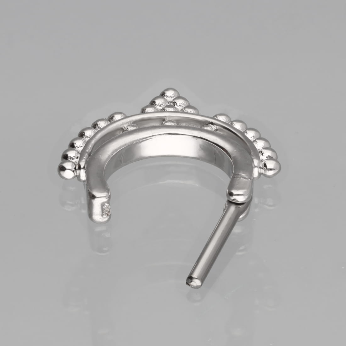 Konstrukcja opiera się na wygodnym mechanizmie typu clicker, który umożliwia sprawne otwieranie i zamykanie kolczyka bez konieczności używania dodatkowych narzędzi. Dolna część obręczy posiada bogate zdobienie składające się z dwóch rzędów drobnych kuleczek. Zewnętrzny łuk został wykończony symetrycznymi wypustkami, które w centralnym punkcie tworzą ozdobny motyw w kształcie trójkąta. Precyzyjne rozmieszczenie detali nadaje całości geometryczną harmonię.