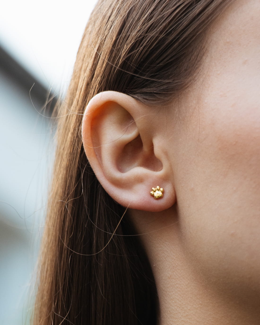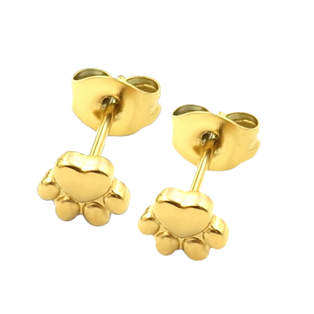 Para delikatnych małych złotych kolczyków na sztyfcie z topem w kształcie psich łapek. Wykonana ze stali szlachetnej w złotym kolorze uzyskanym metodą PVD.