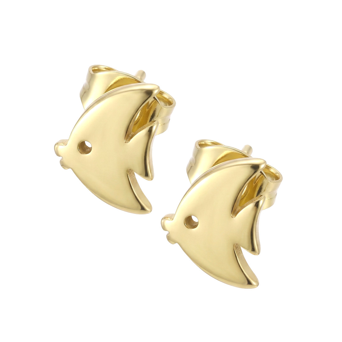 Para delikatnych małych kolczyków na sztyfcie z topem w kształcie skalarów w złotym kolorze uzyskanym metodą PVD. Wykonana ze stali szlachetnej. Rybki w parze nie są symetrycznym odbiciem, są zwrócone w jedna stronę.