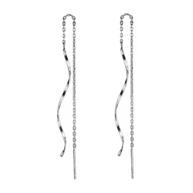 Para, przeciąganych kolczyków ze stali szlachetnej w naturalnym srebrnym kolorze. Kolczyk składa się z cienkiego łańcuszka, o drobnych ogniwach, który przechodzi przez przekłucie w uchu. Z jednej strony łańcuszka przymocowany jest długi, falujący element, który przypomina delikatną wstążkę lub falę. Element ten ma gładką, lśniącą powierzchnię i subtelnie się skręca. Z drugiej strony łańcuszka znajduje się krótka, prosta pałeczka do przekładania przez ucho. Kolczyki mają nowoczesny i dynamiczny design, a ich długość i falujący kształt przyciągają wzrok.