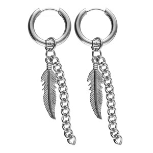 Kolczyki typu huggie ze stali szlachetnej w naturalnym srebrnym kolorze z zawieszką w kształcie piórka.