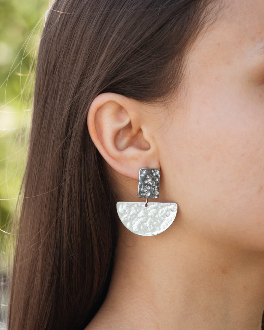Kolczyki wykonane są z jasnego, srebrnego metalu, który podkreśla ich nowoczesny i nieco industrialny charakter. Sztyfty znajdują się z tyłu górnych, prostokątnych elementów, co sprawia, że po założeniu górna część przylega do ucha, a fakturowany półokrąg swobodnie zwisa poniżej.