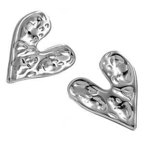 Para efektownych kolczyków na sztyfcie wykonanych z polerowanej stali szlachetnej w naturalnym srebrnym kolorze, o wyrazistym i fakturowanym designie. Mają kształt niesymetrycznych serc w dość niekonwencjonalnej formie, nie są to idealnie gładkie, symetryczne serduszka. Powierzchnia przypomina stopiony metal z wgłębieniami i wypukłościami, co nadaje im trójwymiarowości i sprawia, że światło odbija się od nich w interesujący sposób.