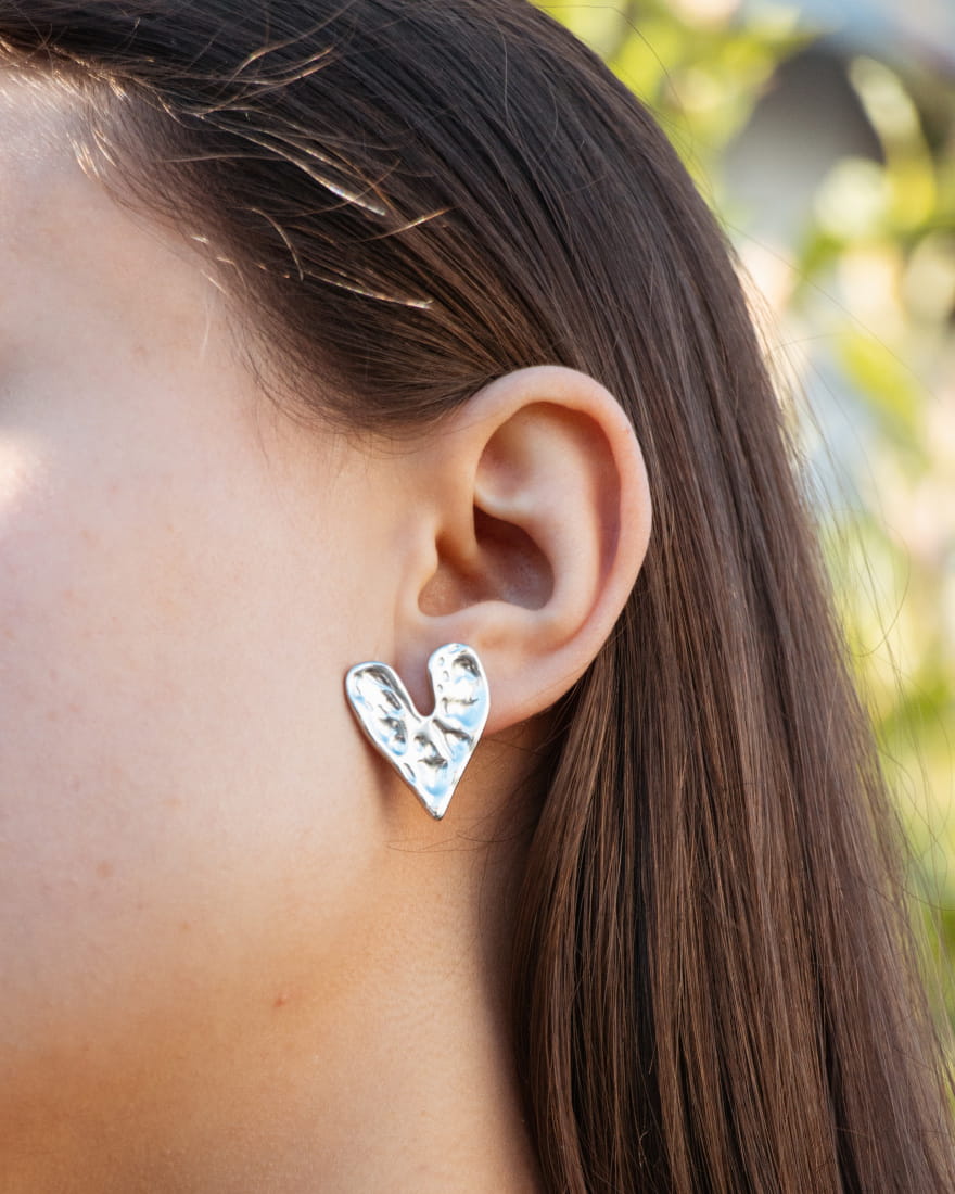 Kolczyki łączą w sobie prostotę kształtu serca z ciekawą, niemal rzeźbiarską fakturą, co czyni je intrygującym dodatkiem.. Ich surowy, ale stylowy wygląd sprawia, że będą ciekawym akcentem zarówno w codziennych, jak i bardziej awangardowych stylizacjach.