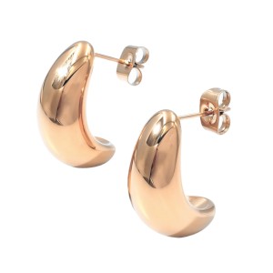 Para kolczyków na sztyfcie wykonanych z polerowanej stali szlachetnej w kolorze różowego złota, uzyskanym metodą PVD. Ich forma przypomina nasiono fasoli, z zaokrągloną, pełną częścią u góry, która stopniowo zwęża się ku dołowi, tworząc otwarty, półokrągły kształt.