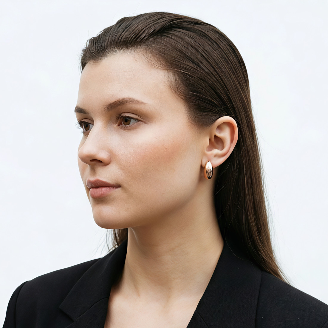 Prosty i nowoczesny kształt kolczyków sprawia, że mogą być zarówno eleganckim dodatkiem do wieczorowej stylizacji, jak i wyrazistym akcentem w codziennym ubiorze. Nie mają żadnych dodatkowych zdobień, co podkreśla czystość formy i blask metalu.