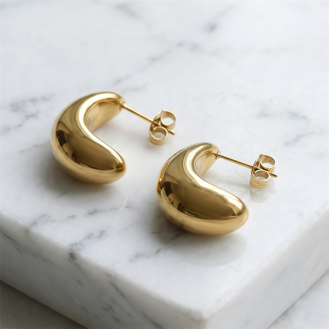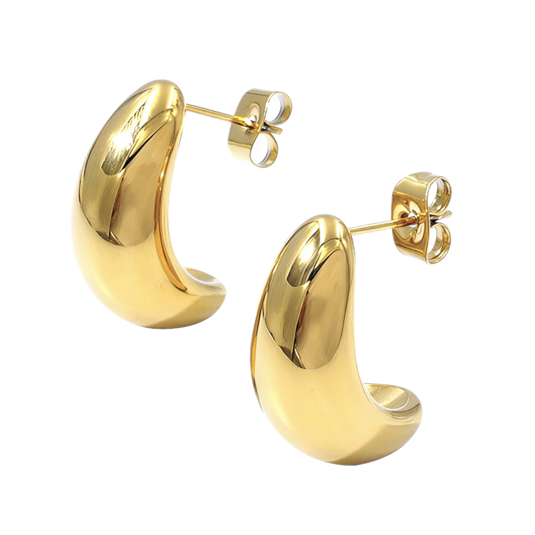 Para kolczyków na sztyfcie wykonanych z polerowanej stali szlachetnej w złotym kolorze uzyskanym metodą PVD. Ich forma przypomina nasiono fasoli, z zaokrągloną, pełną częścią u góry, która stopniowo zwęża się ku dołowi, tworząc otwarty, półokrągły kształt.