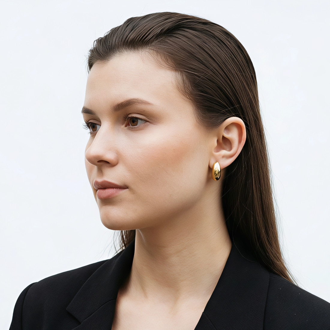 Prosty i nowoczesny kształt kolczyków sprawia, że mogą być zarówno eleganckim dodatkiem do wieczorowej stylizacji, jak i wyrazistym akcentem w codziennym ubiorze. Nie mają żadnych dodatkowych zdobień, co podkreśla czystość formy i blask metalu.