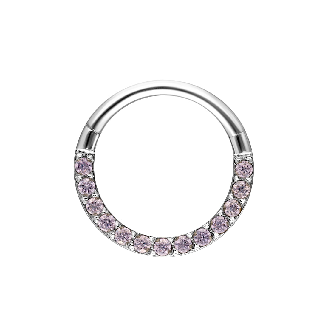 Okrągły kolczyk wysadzany na profilu cyrkoniami, zamykany odcinkiem kółka umocowanym na delikatnym zawiasie. Wykonany ze Stali 316L, materiału trwałego i hipoalergicznego, co czyni go bezpiecznym wyborem nawet dla wrażliwej skóry.
